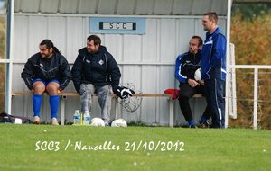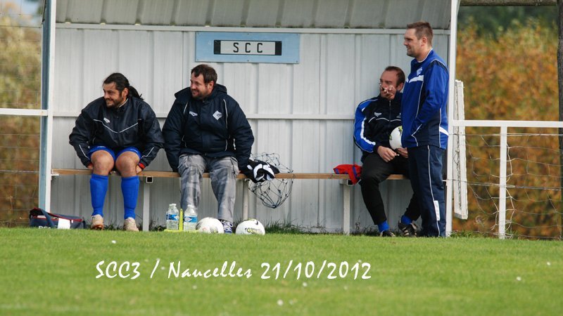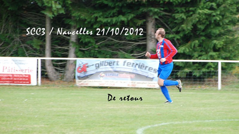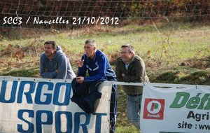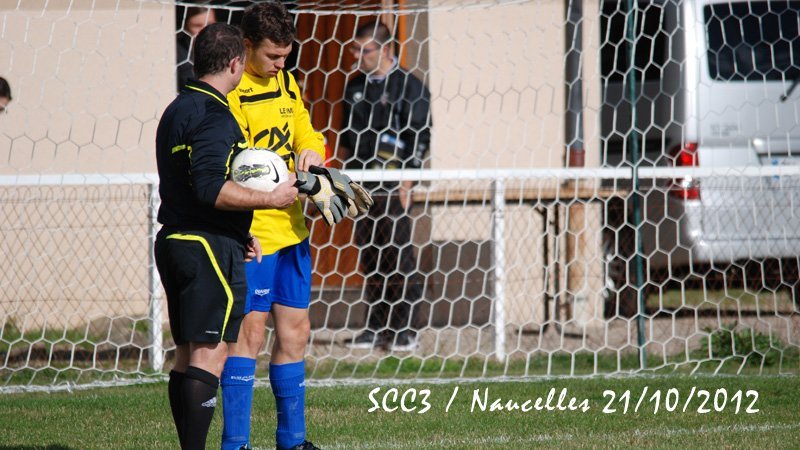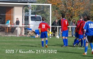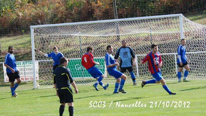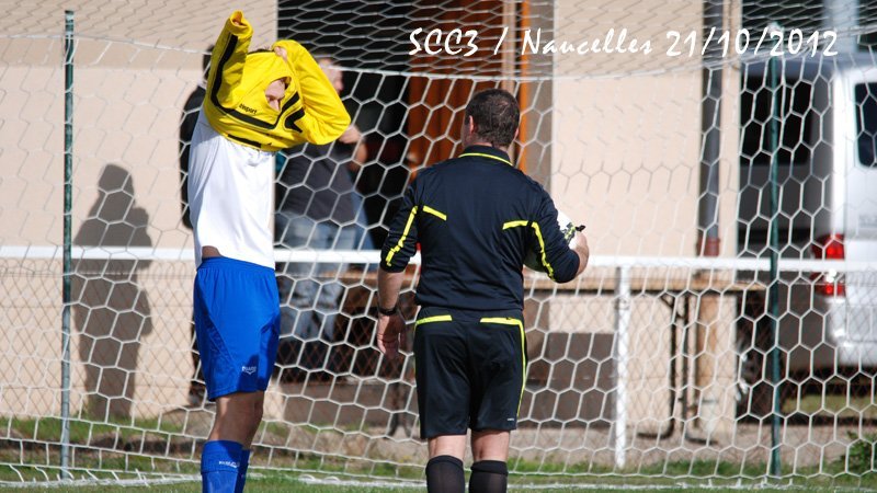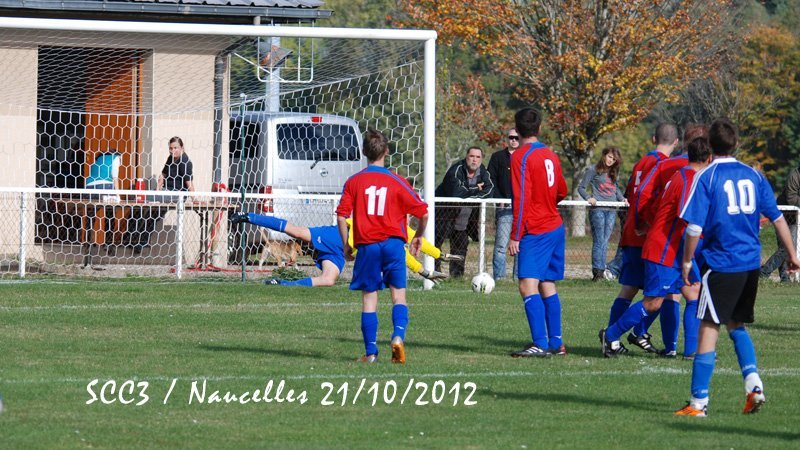 SCC1. En ce samedi 20 octobre le SCC1 affronte la réserve de Thiers chez elle à 20h. Le stade est cerné d'une piste d'athlétisme et semble immense. Il fait très doux mais le vent va forcir en cours de soirée. On assiste à un lever de rideau; c'est l'équipe de CFA2 qui reçoit Pontarlier et va s'incliner par 3-0 et Pontarlier se retrouve leader. Mais le SCC devra jouer contre une équipe réintégrant tous les remplaçants non entrés. On a par contre le grand plaisir de retrouver lors de ce match de CFA2 Julien Mas qui a quitté Cassaniouze il y a bien longtemps et joue actuellement à Thiers. Dès la 2ème minute un des renforts le 11 déborde, adresse un centre qui lobe Jean-Vincent et trouve la tête d'un joueur au second poteau. Après un rebond sur le dos de Jérémy Blanquet la balle part en cloche dans la lucarne. La possession du ballon s'équilibre et après plusieurs fautes subies le SCC hérite de 2 corners. Aux 15 et 16° minutes c'est Thiers qui hérite de 2 coups francs lointains qui avec le vent sont difficiles à gérer pour notre gardien. A la 28° sur une passe ratée il y a danger sur notre but mais Jean-Vincent et Clément Lescure sauvent la situation. A la 31° à la suite d'un coup franc sur Jérémy Gandilhon, le SCC frappe un coup franc Romain Lescure reprend de la tête mais son ballon frôle le pied du poteau. A la 33°, tir de Jérémy Blanquet dans les mains du gardien. 35°: le 7 déboule sur le côté et Jean-Vincent réalise une parade décisive. Après la pause Damien Ernest et Vincent Gouzou font leur entrée. Après un période où le ballon va et vient d'un camp à l'autre le SCC domine et se montre pressant. A la 62ème minute le SCC obtient un corner et Thiers ne peut que dégager en corner. Sur ce second corner Romain Tinet met le ballon en retrait pour Titi Hijano qui lui redonne; Romain approche de la surface, centre mais subit un tacle. Sur le centre David Tuesta marque mais c'est là que l'impossible se produit: l'arbitre particulièrement mal placé, tournant le dos au ballon, siffle un coup franc pour le SCC alors que jusqu'alors il était toujours revenu sur les avantages perdus après une dizaine de secondes. Là il a sifflé d'entrée et donc non validé ce but. Malgré ses excuses les plus plates il venait de plomber un SCC qui s'était bien remis dans le match. Par la suite notre arbitre déboussolé perdra un peu le fil de son match tout en passant toute la fin de la partie à s'excuser. A la 66° sur un corner pour le SCC, le 14 de Thiers fait une belle remontée et centre pour le 11 dont tête passe au dessus. A 3 minutes de la fin notre capitaine perd un ballon sur la ligne médiane le long de la touche. Le 11 récupère, centre. Après un relais de la tête la balle arrive au 13 qui est seul est frappe, Jean-Vincent se couche bien et la dévie mais seulement sur le poteau et ce ballon revient dans les pieds d'un thiernois qui clôt la marque. La fin du match est sifflée et pendant de longues minutes encore l'arbitre se confondra en excuses et le président de Thiers reconnaitra que le SCC ne méritait pas cela. Avant de prendre la route le SCC sera invité à une collation pendant laquelle Jean-Vincent et Julien se remémorent avec plaisir leur complicité quand ils jouaient ensemble en 17 ans national. Face à une bonne équipe le SCC n'a pas engrangé de points et les coachs et les joueurs ne sont pas abattus et sont décidés à travailler et relever les défis. SCC2. Pendant que le SCC1 est à Thiers, le SCC2 reçoit Doire Bertrande à Lacapelle. A l'occasion Victor Picaronie et Anthony Peyrou qui n'ont pas pu se libérer plus tôt sont sur le terrain. Mais il est dit qu'on ne pouvait pas jouer ce soir au Fraisse. Pendant la première période le vent très violent annihile toute construction et le jeu du SCC2 ne peut pas se mettre en place contre des adversaires plus à l'aise avec un jeu très direct. En fait il ne passera pas grand-chose et il n'y aura pas d'occasions. C'est à la pause que l'évènement de la soirée se produit. 2 minutes après le coup de sifflet une épaisse fumée se lève d'un poste EDF sur la route et la nuit totale tombe sur le terrain de Lacapelle. Tout le monde en prend son parti et nous nous retrouverons une autre fois. SCC3. C'est dimanche que le SCC3 conclut le weekend en recevant Naucelles. Avec le vent Naucelles domine le début du match. A la 15° sur un ballon anodin notre gardien Julien Fric est victime une fois de plus de sa rotule récalcitrante et doit quitter le terrain et c'est encore Yannick Viennot qui va suppléer dans les buts. Sur un coup franc il réalise une belle parade (voir photo) et quelques minutes plus tard (30°) il fait un magnifique arrêt sur un pénalty. Malgré la domination de Naucelles, Yoan Marcillac adresse un bon centre que Clément Nolorgues ne peut reprendre entre 2 défenseurs. A la 45°+3 Clément déborde mais sa frappe est contrée et va en corner. Sur celui-ci Naucelles remonte le ballon et obtient un coup franc aux 16m qui ne donnera rien. En seconde période le SCC est moins gêné par le vent. A la 60ème minute Clément est bien servi en profondeur par JC Teissèdre mais échoue sur le gardien. A la 65°, retour de Nicolas Meyniel sur les terrains et sur un service de JC, Clément, aux 20 mètres, est au duel et arrive à servir Yoan sur le coté gauche, Yoan peut centrer et JC récupère et en se retournant ouvre le score. Jusqu'à la fin du match le ballon va d'un but à l'autre mais les gardiens font bonne garde. A la 72ème le bon 11 de Naucelles fait une roulette spectaculaire mais rate le cadre. 3 minutes après, Clément décale Nico Meyniel qui oublie le ballon mais JC peut centrer pour Clément fait une belle tête plongeante malheureusement non cadrée. Dans la minute suivante Nico déborde, centre. Yoan reprend de la tête mais trouve la barre. A la 80 Nico sert Clément mais sa frappe est une nouvelle fois détournée en corner. 81èm