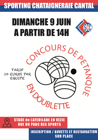 DIMANCHE 9 JUIN 2019 SE DEROULERA A PARTIR DE 14H00 SALLE POLYVALENTE DE LAFEUILLADE LE CONCOURS DE PETANQUE DE FIN DE SAISON DU SCC. JET DU BUT 14H00 - 10 EUROS PAR DOUBLETTE - LOTS - VENEZ NOMBREUX.
